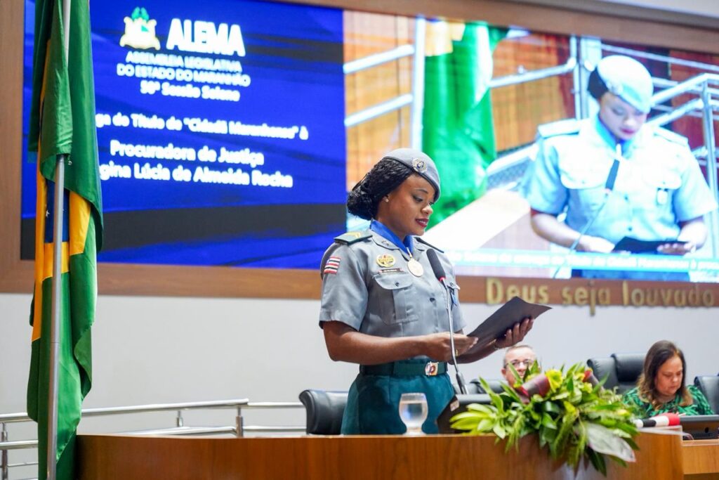 A Assembleia Legislativa do Maranhão realizou, na tarde desta quinta-feira (9), sessão solene para entrega do Título de ‘Cidadã Maranhense’ à procuradora de Justiça Regina Lúcia de Almeida Rocha e a Medalha do Mérito Legislativo ‘Marina Firmina dos Reis’ à policial militar Amanda Vanylla Seixas Ferreira. O ato, realizado no Plenário Nagib Haickel, foi proposto pelo deputado Catulé Júnior (PP).