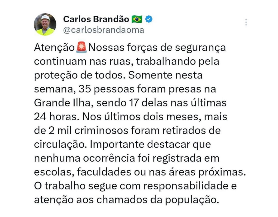 O governador Carlos Brandão anunciou, por meio das redes sociais, o reforço das ações de segurança pública na Grande Ilha e a ampliação do número de prisões realizadas nas últimas semanas. Segundo o chefe do executivo estadual, somente esta semana 35 pessoas foram presas, sendo 17 delas nas últimas 24 horas. Nos últimos dois meses, mais de 2 mil criminosos foram retirados de circulação em todo o Maranhão.