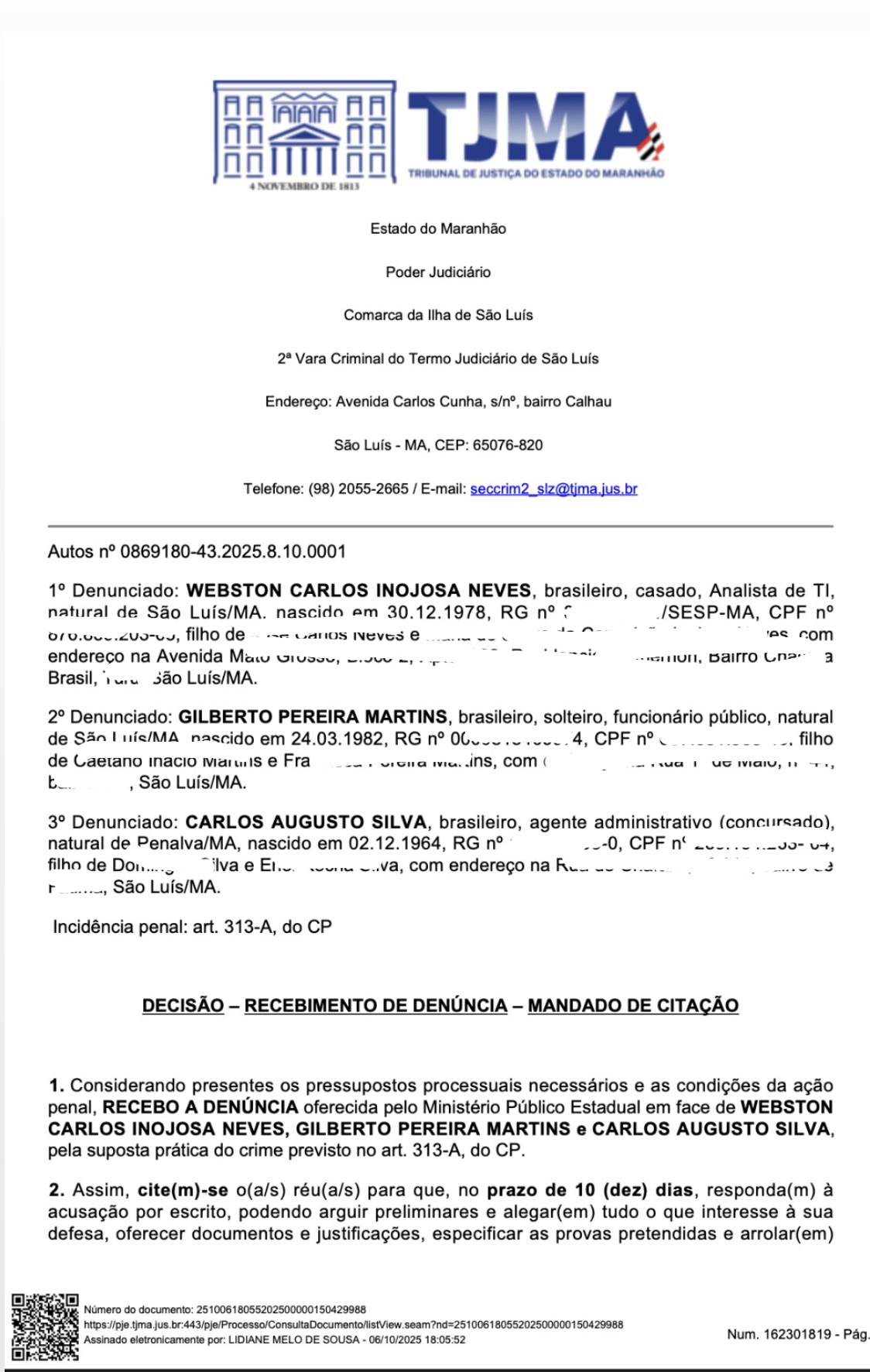 A denúncia foi recebida pela juíza Lidiane Melo de Souza, da 2ª Vara Criminal de São Luís, em decisão assinada no dia 6 de outubro de 2025. O documento determinou a citação formal dos acusados e destacou que há provas suficientes para abertura da ação penal.