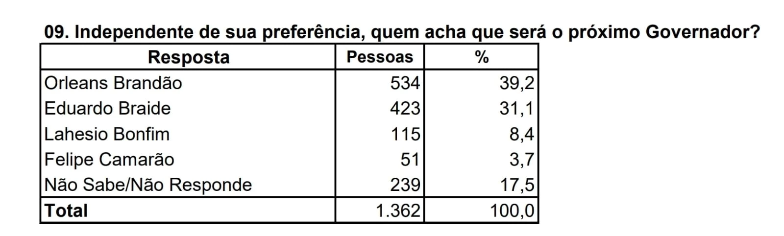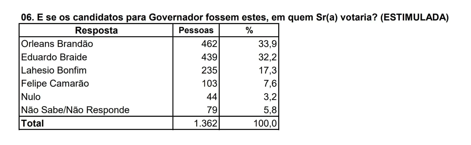 No cenário estimulado, quando são apresentados os nomes dos candidatos, mais uma vez empate técnico, só que desta vez, com Orleans Brandão seguido por Braide, como é possível ver no quadro abaixo.