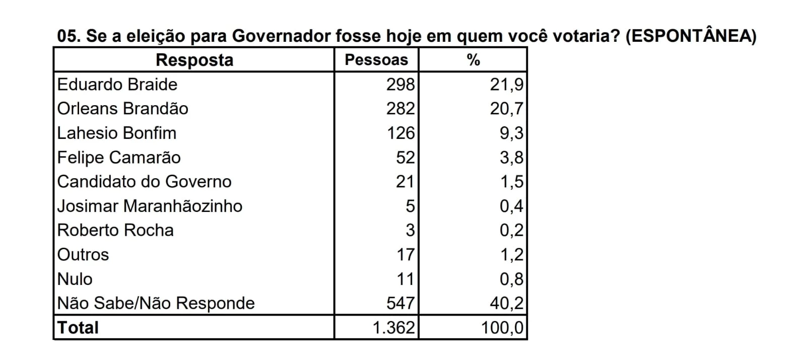 No cenário espontâneo, por exemplo, há um empate técnico entre os dois primeiros colocados, tendo o prefeito de São Luís, Eduardo Braide (PSD), com 21,9%, sendo seguido pelo secretário de Assuntos Municipalistas, Orleans Brandão (MDB), com 20,7%.