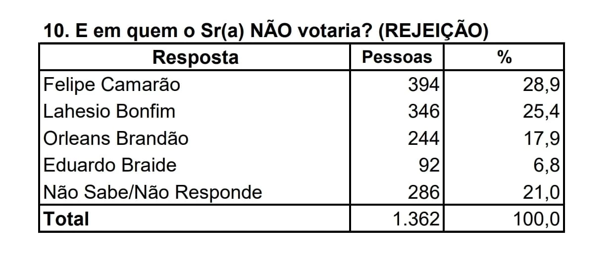 A pesquisa também mediu o tamanho da rejeição de cada pré-candidato, e apenas neste quesito, o petista Felipe Camarão segue liderando.